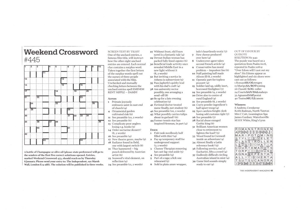 This was the first crossword puzzle I had published in the Independent Weekend Magazine. Thanks to Mike Hutchinson, Independent Crossword Editor and the newspaper for allowing me to publish it.