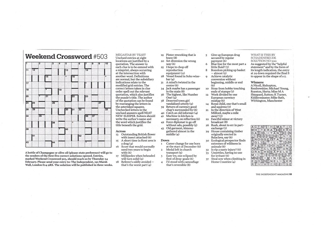 This was the third crossword puzzle I had published in the Independent Weekend Magazine. Thanks to Mike Hutchinson, Former Independent Crossword Editor and the newspaper for allowing me to publish it.